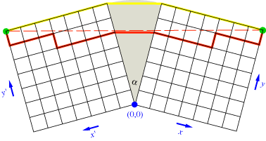 For this simple model one can write down the distance between a point in the left and a point in the right grid, as a function of the transition points where the walker enters or leaves the transition region. It is most convenient to use different coordinate system in the grids: Both have (0,0) at the point where the grids touch and increase y moving upward and x moving away from the crack. Note that the y coordinate of the transition point can vary continously since the walker may decide to leave the grid everywhere on the street that runs along the crack.