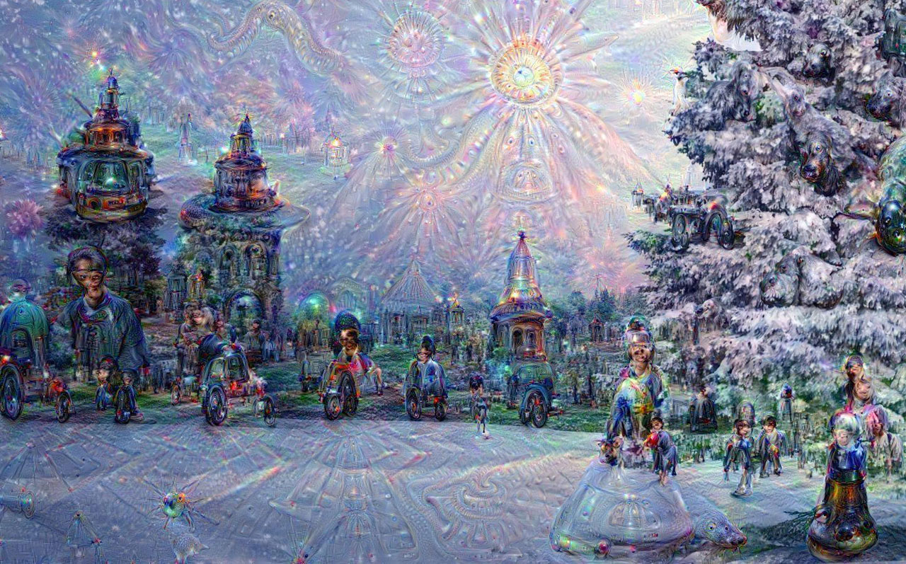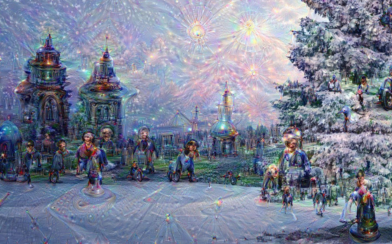 Update 2015-12-31: In the comments, Ed Jones asks, “If the original image is changed slightly, how much do the deep dreaming images change?” It’s a very good question, but I don’t have a very good answer.